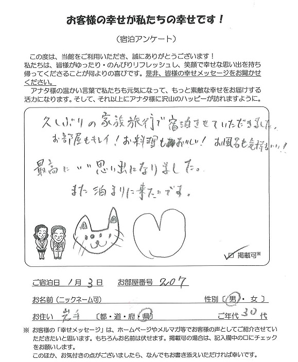 1月にご宿泊されたお客様のアンケートのうち、掲載許可をいただいたものをご紹介します♪